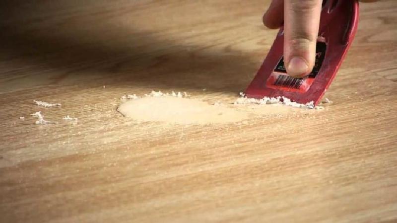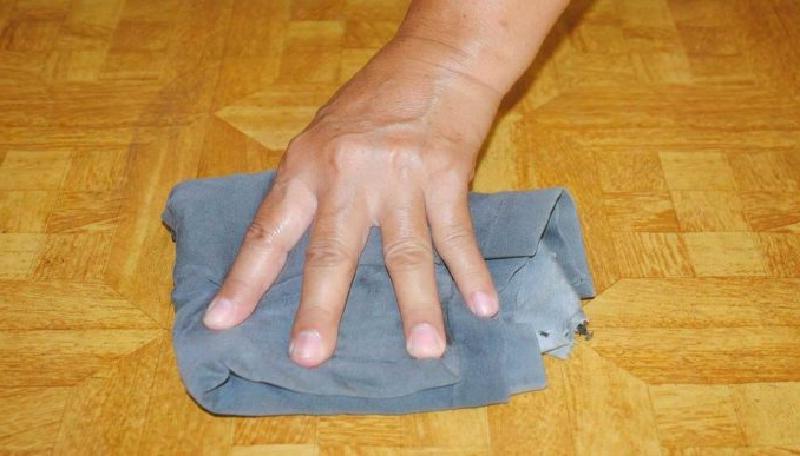 Во время ремонта на пол может капнуть гипсовая или цементная штукатурка, которая способна быстро затвердеть, из-за чего от нее будет непросто избавиться. Но все-таки сделать это можно, если на загрязненную поверхность положить мокрую тряпку, смоченную в горячей воде, на 10-15 минут, чтобы она размягчила штукатурку и ее легко было удалить с помощью шпателя.