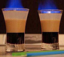 - «Б-52». В приготовлении участвуют такие ликеры, как "Quantreau" (Куантро, можно использовать покупной или приготовленный собственноручно), «Irish Cream» и кофейный (по 20 мл). В бокал аккуратно наливайте по лезвию ножа по очереди кофейный ликер, «Irish Cream» и апельсиновый ликер. Коктейль поджигают. Именно в этот момент необходимо успеть вставить трубочку и быстро выпить коктейль, начиная с нижнего слоя, пока горение не прекратилось. Этот напиток не только вкусный, но и очень коварный, а потому злоупотреблять им не стоит!