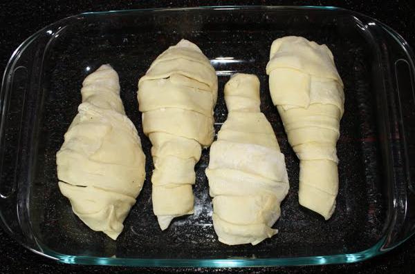 Осуществив все описанные действия, необходимо взять одну полоску теста и обмотать ею предварительно обжаренную и остывшую голень. Делать это рекомендуется внахлест, но так, чтобы кончик ножки выходил наружу.