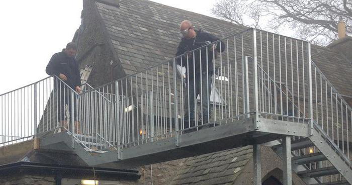 Она осуществляется с помощью специальных инструментов. К ним, в частности, относится ручная лебедка и устройство для измерения усилия. В процессе проверки прочности ступеней нагрузка устанавливается строго по их центру. При испытании кровельных и лестничных ограждений она может быть в любой точке. Лестничный марш должен выдержать не менее 750 кг, вертикальная конструкция – 180 кг. Данные параметры соответствуют нагрузке при активном перемещении взрослого человека. Лестничные ограждения проверяются на способность выдерживать вертикальное усилие. В процессе эвакуации эти элементы имеют особое значение. Их задача состоит в предотвращении падений и травм. Это, в свою очередь, крайне важно для исключения давки и паники, поскольку может привести к жертвам. Проверка нагрузки проверяется также с помощью лебедки. Она закрепляется в определенных точках, расстояние которых не больше 10 м. После этого создается усилие. Его фиксирует динамометр. Усилие должно удерживаться 2 мин. Если возник прогиб, его величина фиксируется специальным инструментом. После испытания осуществляется осмотр всей конструкции на наличие остаточной деформации. На лестнице должны отсутствовать следы нагрузки и неровности. Если же они обнаружены, то элементы, на которых они присутствуют, подлежат обязательной замене. В процессе проверки проверяется жесткость крепления к стене. При выполнении испытания не допускается нахождение людей под конструкцией.