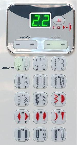 - светодиодный дисплей, отображающий номер строчки и длину или ширину стежка. Выбранная на панели операция всегда подсвечивается определенным цветом, что исключает ошибки в выборе строчки;