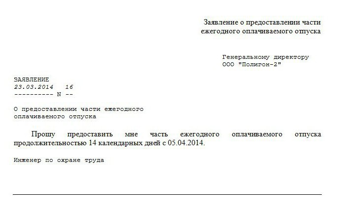 - Текст (в теле заявления необходимо указать просьбу о предоставлении того или иного типа отпуска, с указанием даты составления документа и подписи сотрудника. Если отпуск планируется дробить, нужно указать период отдыха. При неоплачиваемом отпуске нужно указать причину, по которой отдых должен быть предоставлен).