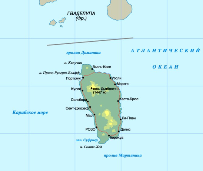 Где находится остров Доминика? Чтобы не было путаницы, давайте определимся с географией островного государства. Остров Доминика является самым большим из Наветренных островов, находящихся в Карибском море. Содружество Доминики занимает территорию всего острова, площадь которого составляет 754 км. кв. Он имеет вулканическое происхождение и, по мнению ученых, самый молодой из Антильского архипелага. Самой высокой точкой региона является вулкан Дьяболтен, высота которого - 1447 метров над океаном. Считается, что на острове нет действующих вулканов. Но все же наличие гейзеров и активных горячих источников свидетельствует о том, что глубоко в недрах идут процессы. На территории страны расположено уникальное озеро с вечно кипящей водой, которое является вторым по величине в мире.