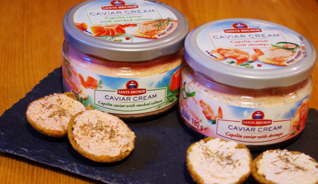 - После проведенных действий открываем баночку с икрой мойвы "Санта Бремор". Почему именно она? Все довольно просто: по отзывам тех, кто имеет дело с этим видом икры, очень часто, именно эта марка им нравится. В эту икру добавлен соус на основе майонеза и микроскопические кусочки копченого лосося.