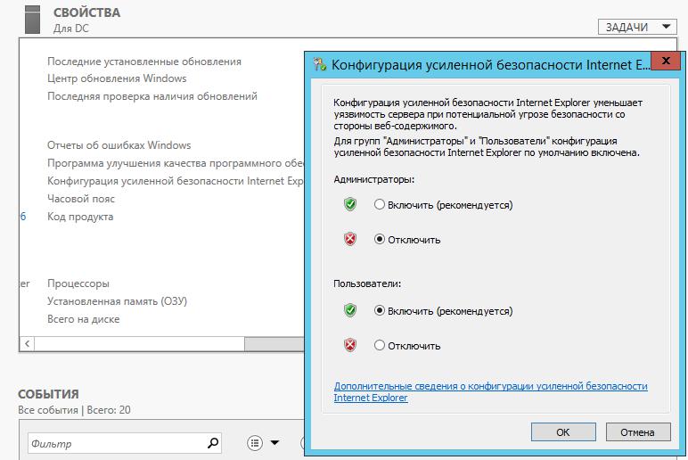 В серверных системах 2008 и выше деактивация конфигурации усиленной безопасности производится из «Диспетчера серверов», где можно воспользоваться соответствующими настойками.