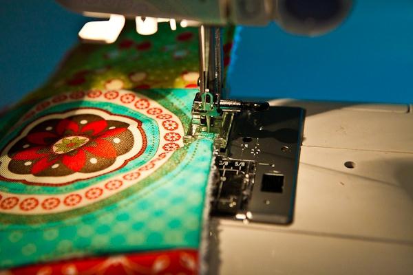 ![]() | Прокладываем строчку по трем сторонам. Получается что-то вроде большой наволочки. Выворачиваем ее на лицевую сторону. |