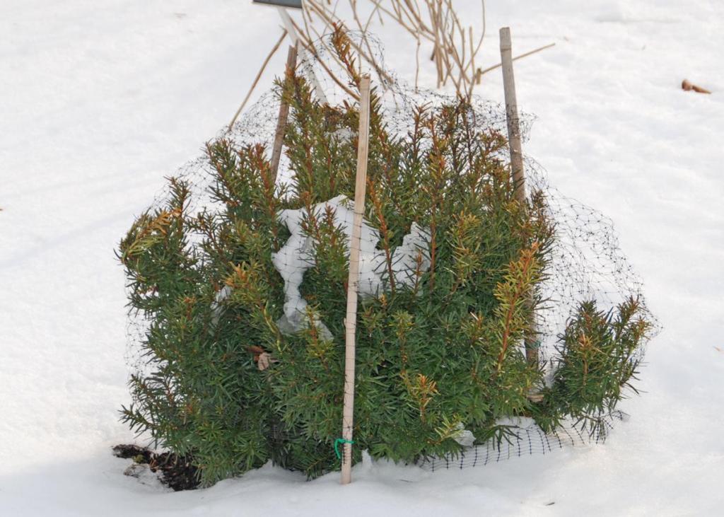 Используйте полоски хлопка, чтобы свободно связать несколько стеблей вместе, чтобы снег скатывался по растениям на землю. Или заверните весь куст или живую изгородь в сетку для ловли птиц. Сетка сливается с листвой, поэтому растения будут в безопасности и придадут красоту зимнему пейзажу. Сетка также помогает отпугнуть голодных диких животных.