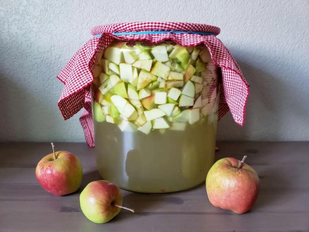 Дополнительно стоит добавить небольшое количество уже готового яблочного уксуса. Это поможет стимулировать брожение. Перемешать все и накрыть воздухопроницаемым материалом.