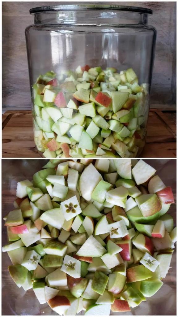 Яблоки или обрезки хорошо вымыть и нарезать кусочками. Поместить их в банку для брожения так, чтобы она была заполнена примерно наполовину.
