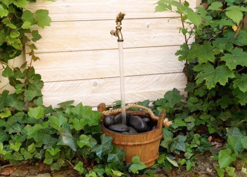 На чем держится кран? Откуда вытекает вода? Похожие вопросы будут задавать знакомые, посещая ваш сад. А всего-то и нужна прозрачная стеклянная или пластиковая трубка, закрепленная в камнях. Она имитирует поток воды. А также приклеенный сверху краник.