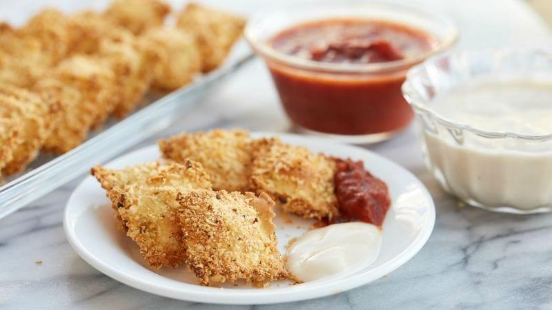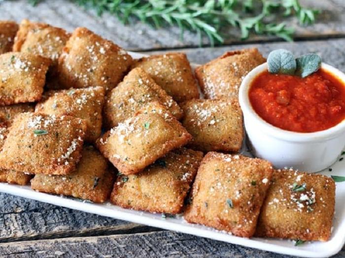 Жареные равиоли можно сделать не только на сковороде, но и в аэрогриле. Блюдо готовят при температуре 200 градусов в течение семи минут. Затем изделия перекладывают на тарелку и посыпают измельченным сыром пармезан. Жареные равиоли – отличный вариант простой, но необычной закуски для дружеской вечеринки. Их можно дополнить любым соусом для макаронных изделий.