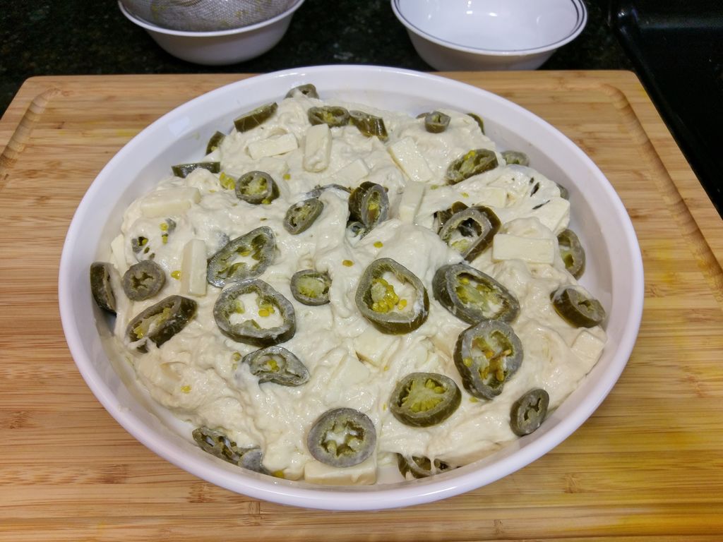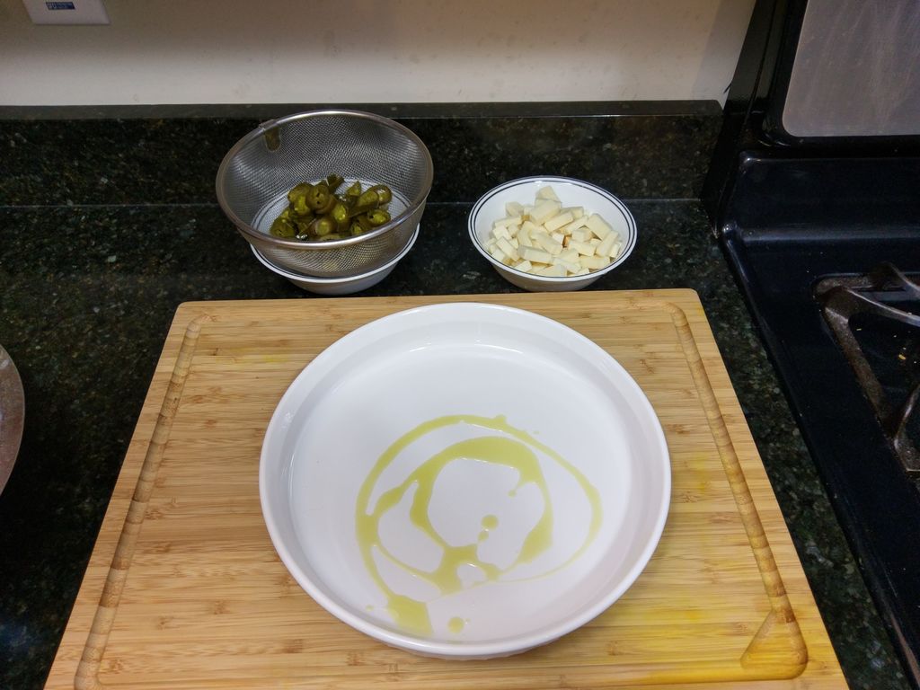 Острый перец (можно использовать как свежий, так и консервированный) нарезаю кружочками, сыр - кубиками. Я беру белый чеддер, но блюдо получится вкусным и с другими видами сыра, например, эмменталем или гаудой.