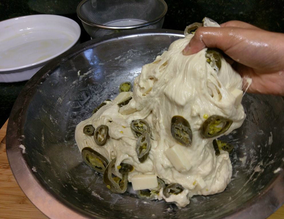 В большой миске смешайте сливочный сыр, измельченный халапеньо, бекон и сыр. Перемешайте. В другой миске смешайте муку, разрыхлитель, соль и сахар. Две смеси ингредиентов аккуратно объедините, добавьте столовую ложку масла и пахту. Замесите тесто.