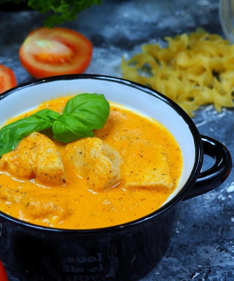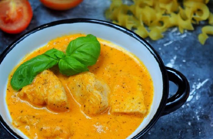 Снова отправляют соус обратно на сковороду. Куриную грудку режут на кусочки. Отправляют в соус. Аккуратно размешивают, чтобы кусочки были полностью покрыты аппетитной томатной массой. Прогревают все вместе еще минут пять или шесть. Можно накрыть крышкой, чтобы все пропиталось специями.