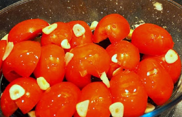 Для этого нужно промыть помидоры. Срезают верх, с плодоножкой. Укладывают их на дно кастрюли, добавляют нарезанный и очищенный чеснок. Режут его на лепестки. Поливают оливковым маслом. Можете капнуть совсем немного воды, если боитесь, что блюдо пригорит.
