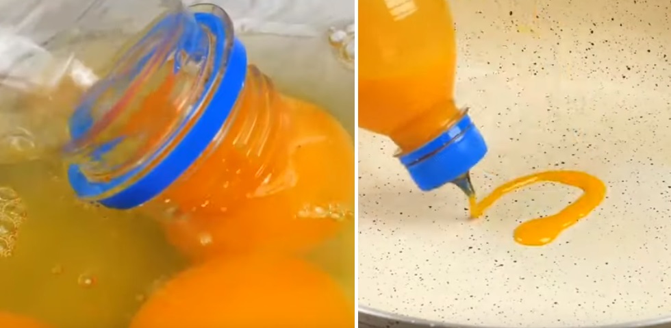 А еще отличной идеей для веселого завтрака будет необычная фантазийная яичница. Надо всего лишь отделить желток от белка, воспользовавшись бутылкой. И далее уже включить фантазию, придумав узор из яйца на сковороде.