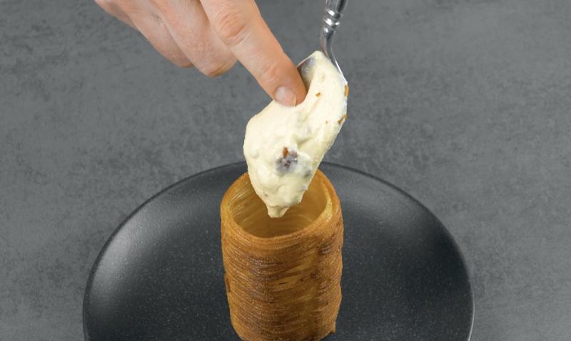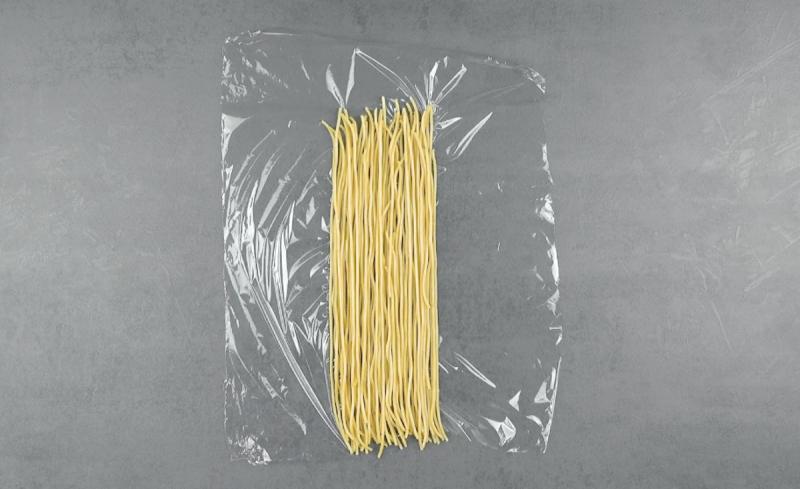 Спагетти накручивают на втулку, не удаляя пленку с их поверхности. Плотно прижимают макаронные изделия к втулке. После этого пленку следует снять.