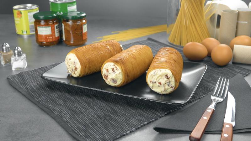 Недавно я узнала фантастический рецепт рулетиков из макаронных изделий. Для их приготовления понадобятся пустая втулка от туалетной бумаги и спагетти. В качестве начинки для блюда используется смесь из вареных яиц, сливочного сыра, пармезана и бекона. Блюдо получается невероятно вкусным и изысканным.