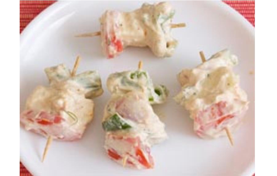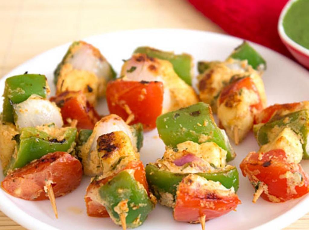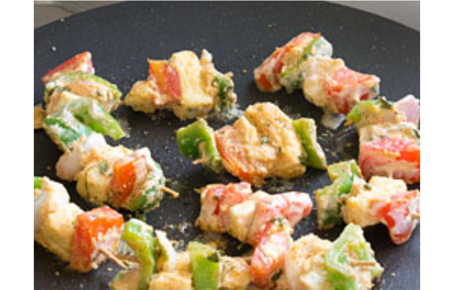 4. Расположите на деревянном шампуре красный перец, затем зеленый, лук, кусочек панира и снова зеленый перец в указанном порядке.