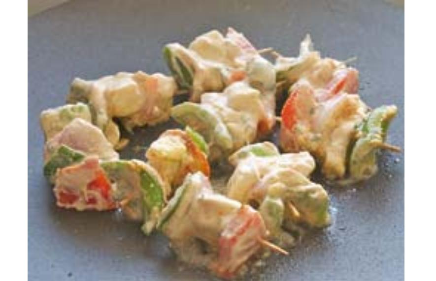 Да, эту закуску я обжариваю на антипригарной сковороде. Сначала ее нужно смазать небольшим количеством масла, а затем нагреть на среднем огне. Готовить нужно на каждой стороне, поворачивая шампуры до тех пор, пока все ингредиенты не станут светло-коричневыми. На это может уйти примерно 3-4 минуты.