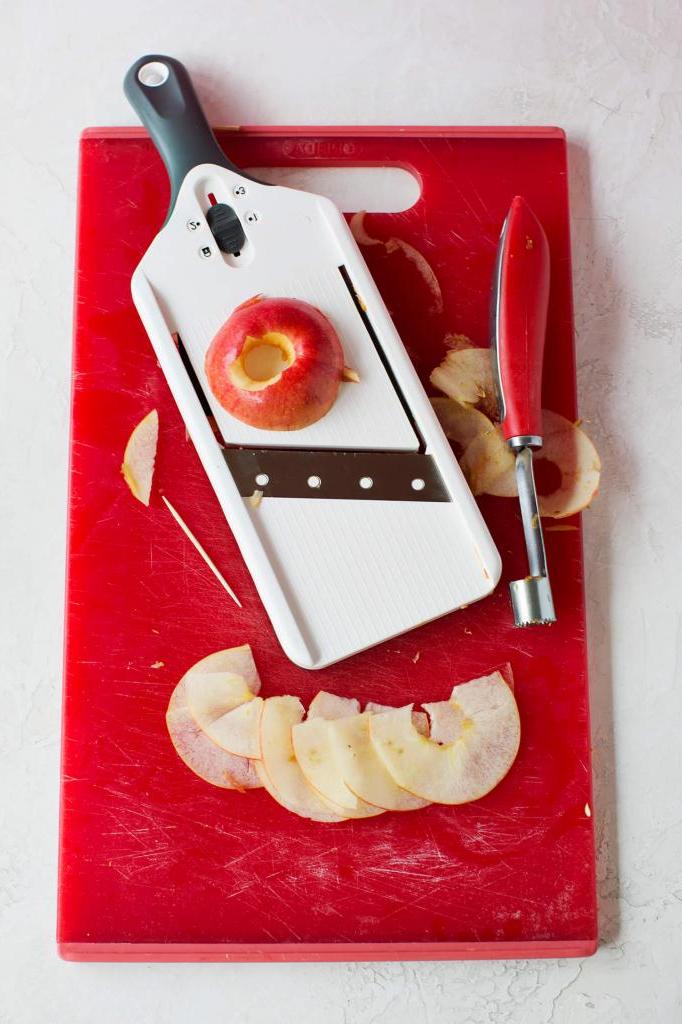 Сначала я вырезаю сердцевину яблока, а затем при помощи мандолины нарезаю его на очень тонкие ломтики. Затем я вместе укладываю 6-8 долек яблока вместе и скатываю их, а затем закрепляю при помощи зубочистки. Получается красивая и оригинальная роза.