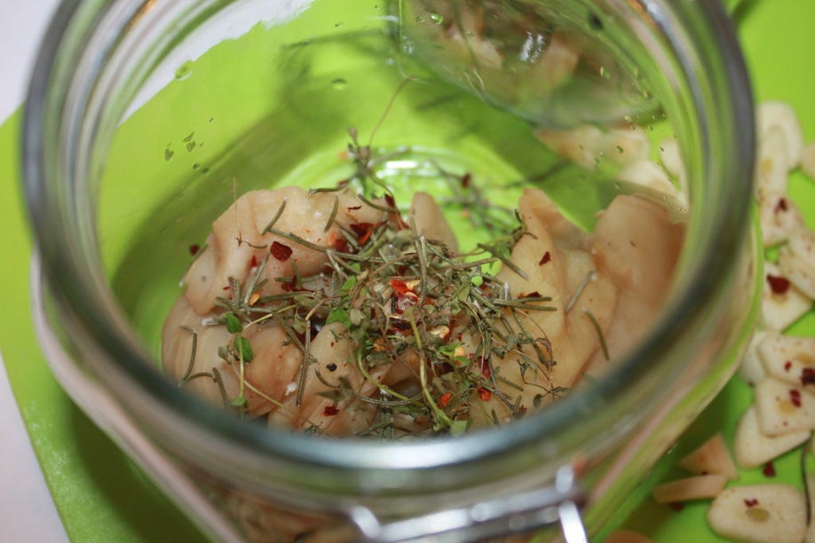 Чем меньше воды будет в овощах, тем они вкуснее получатся. Затем разложите брусочки по банкам, добавьте нарезанный чеснок, пряные травы и кайенский перец, а в завершение залейте подсолнечным маслом, чтобы оно полностью покрывало синенькие. Банки закройте герметичной крышкой.
