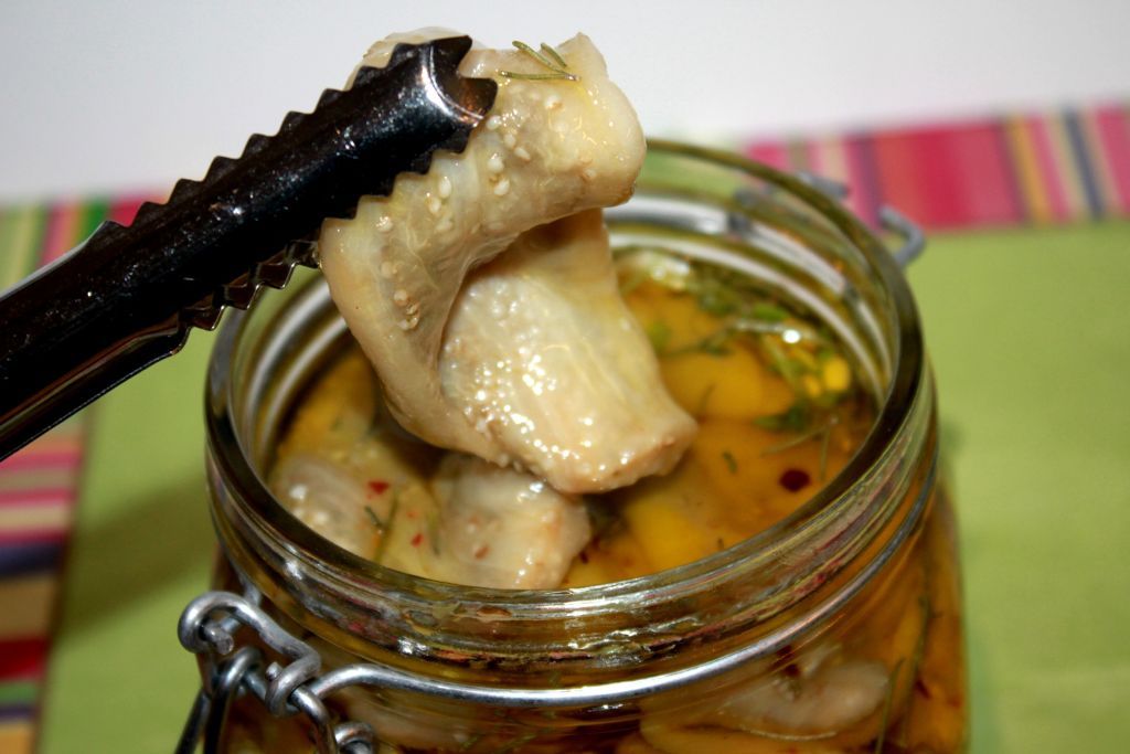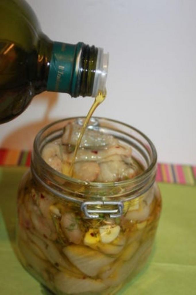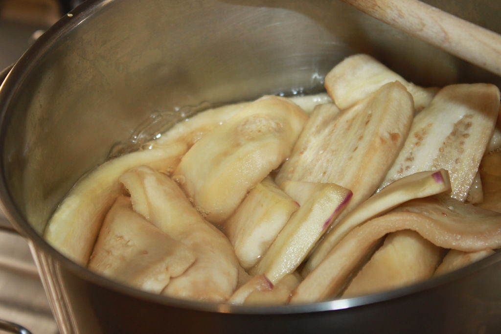 Утром хорошо отожмите баклажаны. Доведите до кипения вино и уксус, положите овощи и готовьте их приблизительно 5 минут, после чего еще раз отожмите.