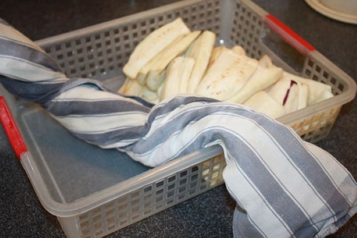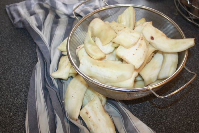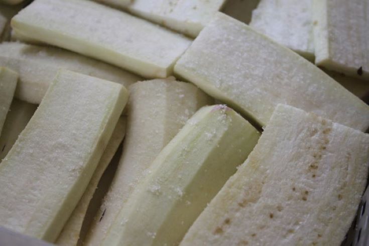 В рецепте нет ничего сложного. Первым делом вам нужно тщательно промыть баклажаны, нарезать брусочками и сложить слоями в большую емкость, пересыпая ряды солью.