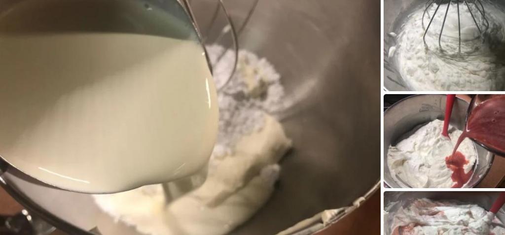 Поместите взбитые сливки и клубничный мусс в отдельные пакеты с отверстиями в уголках. Соус равномерно перемешайте.