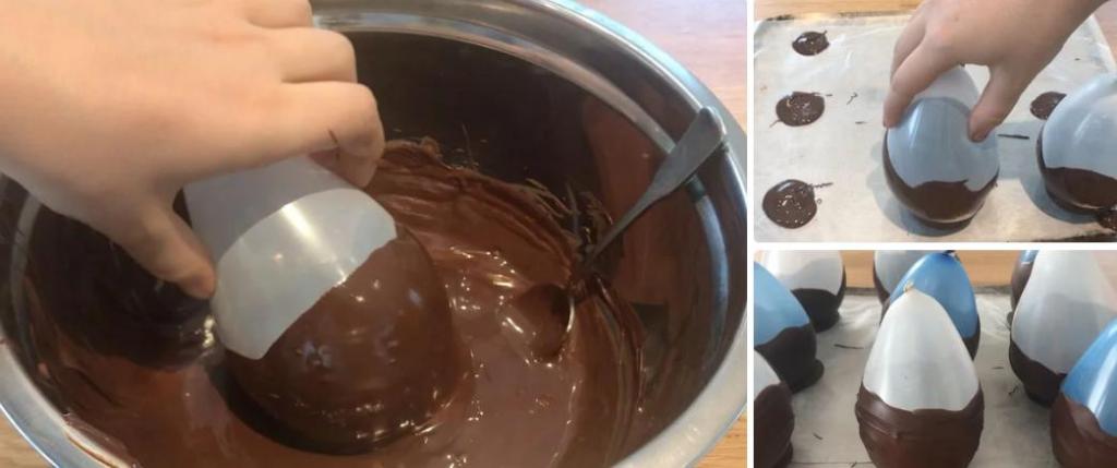 Наполните надувные шарики воздухом, затем поочередно опускайте их в шоколад, слегка катая, чтобы покрыть ровным слоем почти наполовину. Аккуратно приподнимайте их, чтобы избыток массы стекал, затем раскладывайте на вощеной бумаге по сделанным меткам.