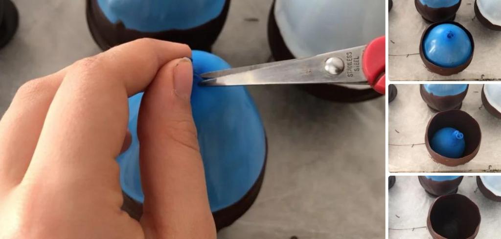 Поместите шарики в морозильник, пока шоколад не затвердеет, затем выньте заготовки и разделите. Я использовала для этого ножницы - осторожно делала маленькую дырочку у узла шарика наверху, чтобы он медленно выпускал воздух. Затем я просто достала их без особых усилий.