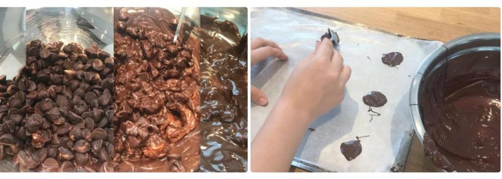 Накройте противень вощеной бумагой. Затем положите небольшие порции расплавленного шоколада (примерно по 1 ст. л.) на подготовленный лист на расстоянии друг от друга. Мне удалось уместить три ряда таких меток по три штуки.