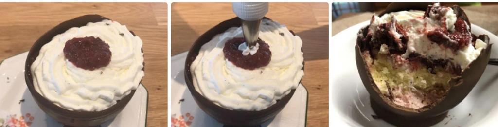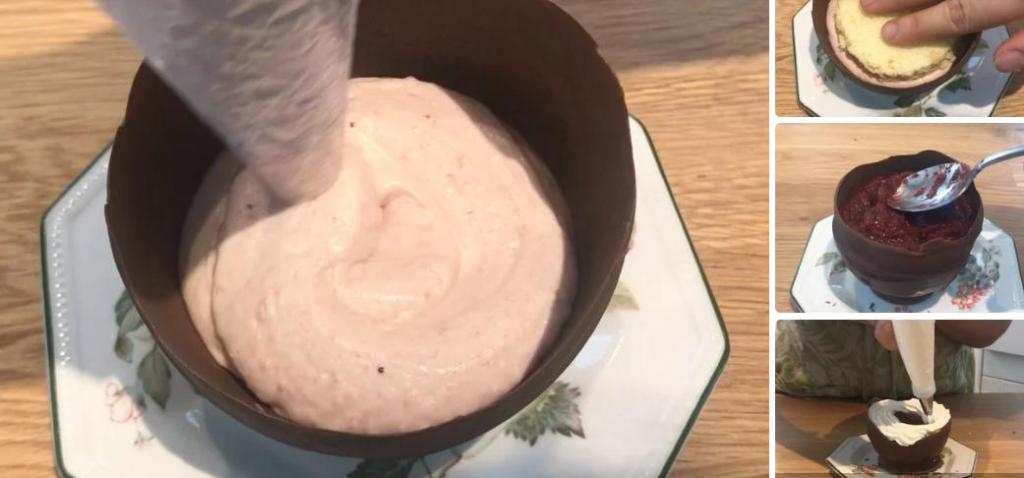 Положите шоколадную чашку на тарелку и наполните нижнюю половину клубничным муссом. Поместите один из вырезанных кругов бисквита сверху и слегка прижмите. Сделайте то же самое со всеми заготовками и поставьте их в холодильник примерно на 2 часа.