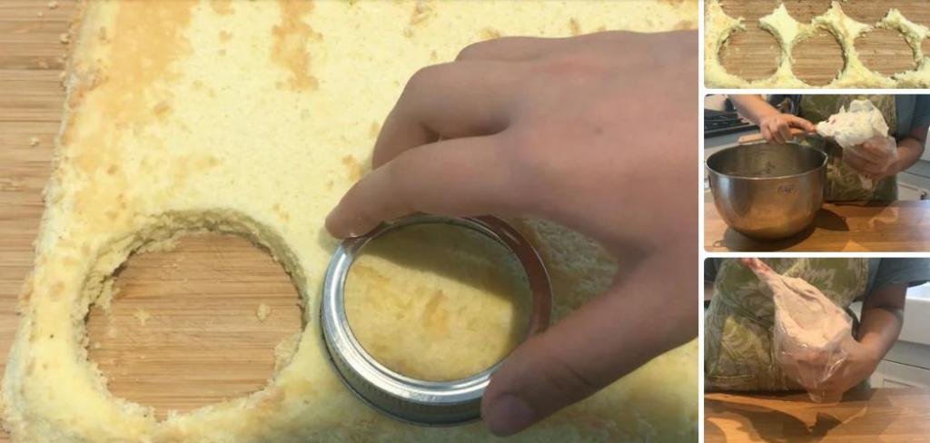 Поместите бисквит на разделочную доску и вырежьте из него кружки, используя крышку для банки.