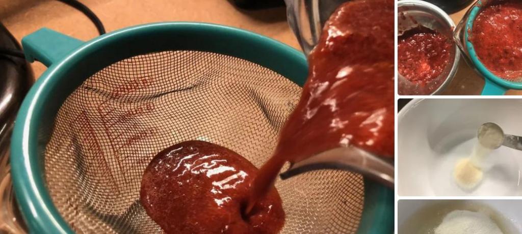 Поместите очищенную клубнику в кухонный комбайн и перемешивайте на средней скорости в течение минуты. Процедите полученное пюре через мелкое сито, и разместите сок и мякоть в разных мисках.