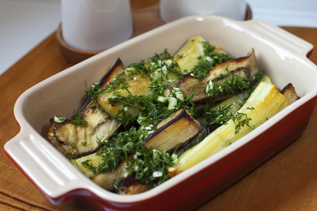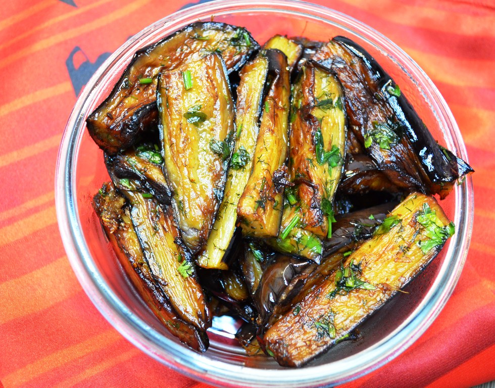Для начала необходимо избавиться от кожуры баклажанов, срезав ее острым ножом. Затем нарежьте овощи пластинками и обжарьте на растительном масле до появления золотистой корочки.