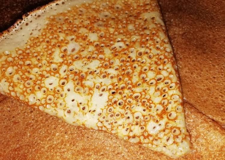 Обжаривают изделие до тех пор, пока на верхней части блинчика не появятся пузырьки и небольшие отверстия. После этого его осторожно переворачивают на другую сторону деревянной лопаткой. Обжаривают блинчик до появления румяной корочки.