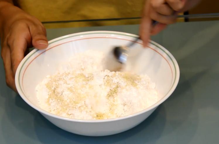 Сначала необходимо высыпать все сухие ингредиенты в миску и перемешивать их ложкой до тех пор, пока они не станут однородной массой. В данном случае я использую сахарную пудру, миндальную муку и семена кунжута, а также щепотку соли. Теперь можно приготовить яичную меренгу.