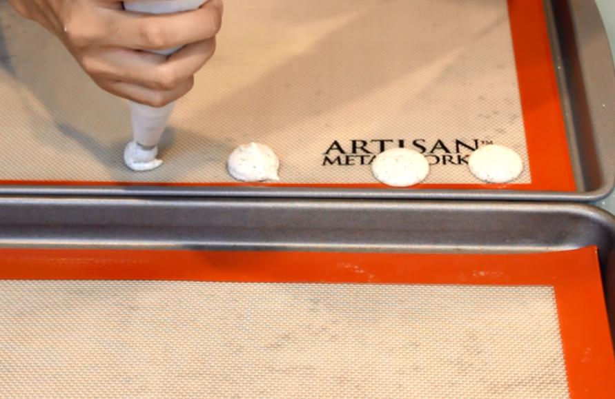 Теперь нужно заполнить смесью кондитерский мешок с большим круглым наконечником. Будущие макароны следует разложить на пергаментную бумагу, которой предварительно застилается противень для выпекания. Между пирамидками нужно оставить пространство. Когда вся смесь будет выработана, нужно легонько постучать противнем по поверхности стола, чтобы холмики превратились в плоские диски.