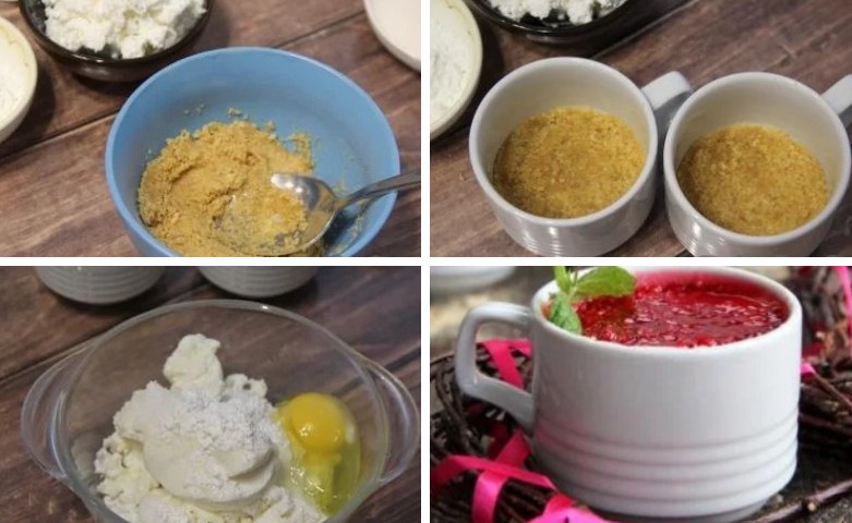 В глубокой посудине растирают творог с яйцами и сахарным песком. Добавляют крахмал, сметану, перемешивают ингредиенты. Пробивают массу погружным блендером до однородного состояния. Раскладывают по чашкам, не заполняя емкости доверху. Ставят посудины в микроволновую печь. Готовят на максимальной мощности около 4 минут. Остужают десерты примерно полчаса. Выкладывают на поверхность выпечки варенье или джем. Можно подать чизкейки прямо в чашках, в которых они готовились.