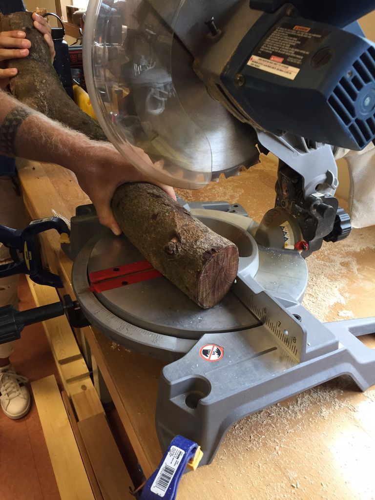 Бревна, найденные при прогулке по лесу, подпиливать придется обязательно. При этом процессе важно не только отметить необходимую длину, но и произвести распил так, чтобы нижнее основание будущего подсвечника было идеально ровным, не скосилось. Это достаточно сложная задача, особенно при использовании ручной пилы. Упростить работу можно при помощи тисков, в которых следует крепко зажать бревнышко.