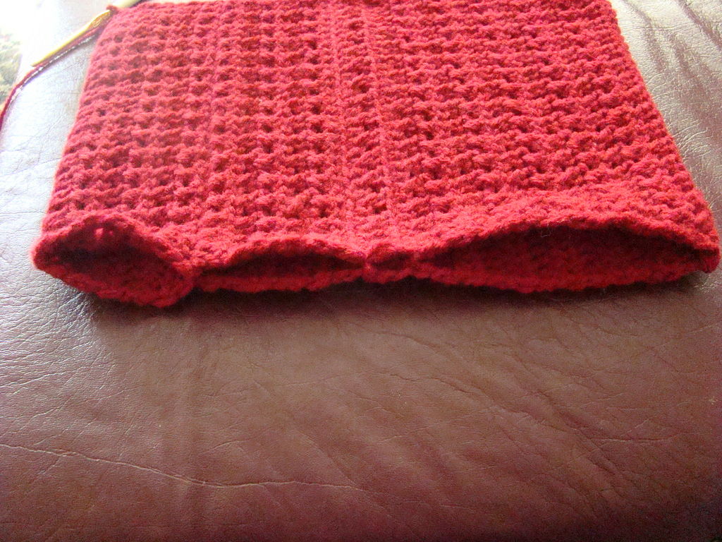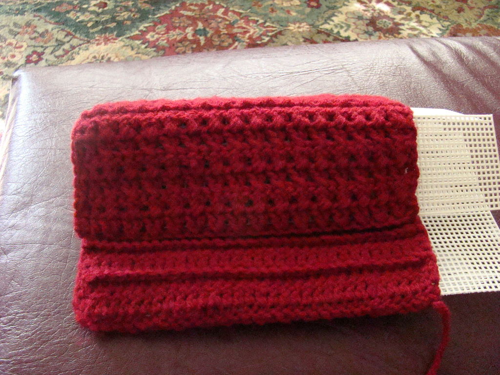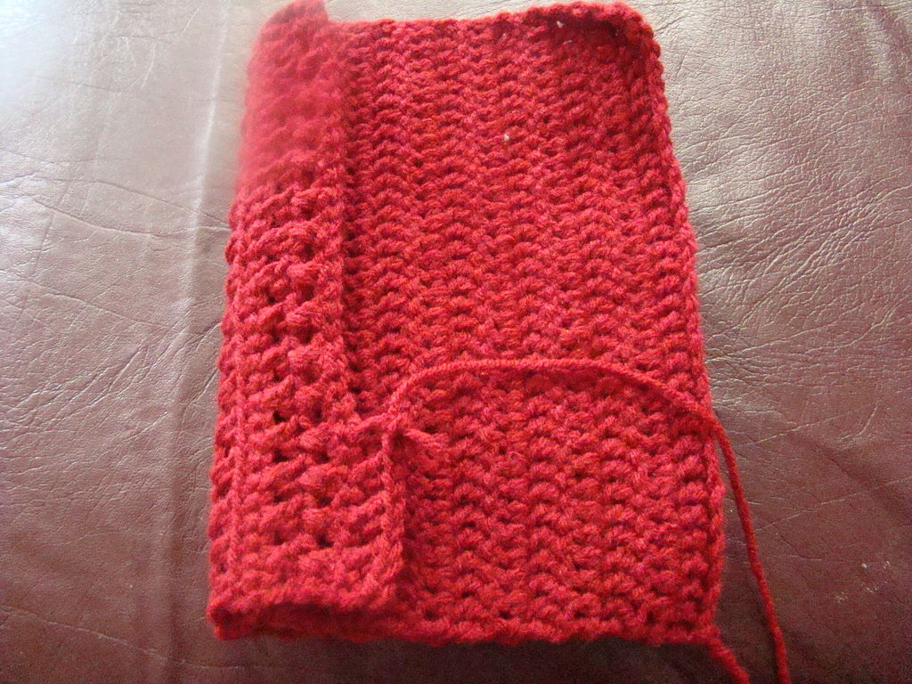 Сложите разделенную сторону и создайте угол 90 °, прижимая конец к поверхности твердой стороны. Единственное вязание крючком вдоль линии, где этот край отдыхал. Эта линия поможет удержать край от скольжения. Одно двойное вязание крючком шириной от первой линии, одно вязание крючком другой линии. Это будет защищать планшет от скольжения. Без этого шерстяной карман будет слишком скользким и гладкий планшет будет периодически выскальзывать.
