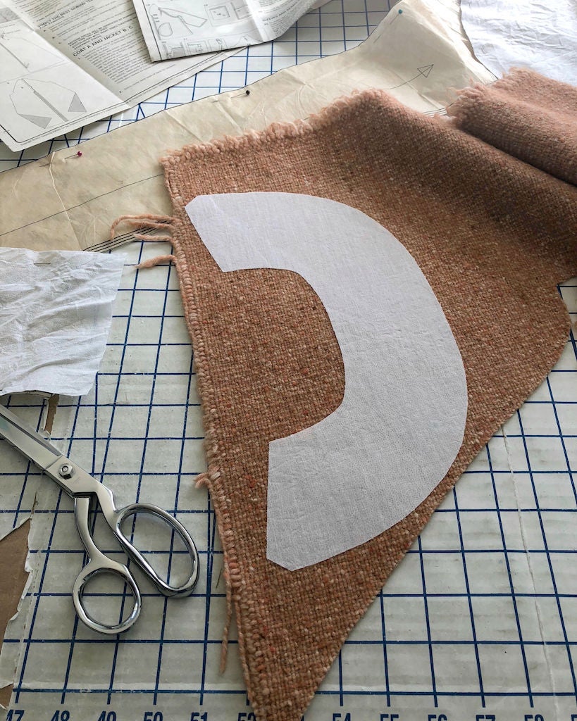 Определившись с лицевой и внутренней стороной ткани, перенесите выкройку на материал, а затем вырежьте все необходимые детали. Оставьте два небольших кусочка, чтобы проверить, как ваша машинка справится с двумя слоями плотной шерсти. Возможно вам придется слегка изменить настройки или подобрать подходящую иглу.