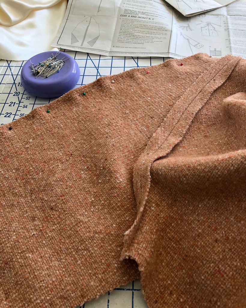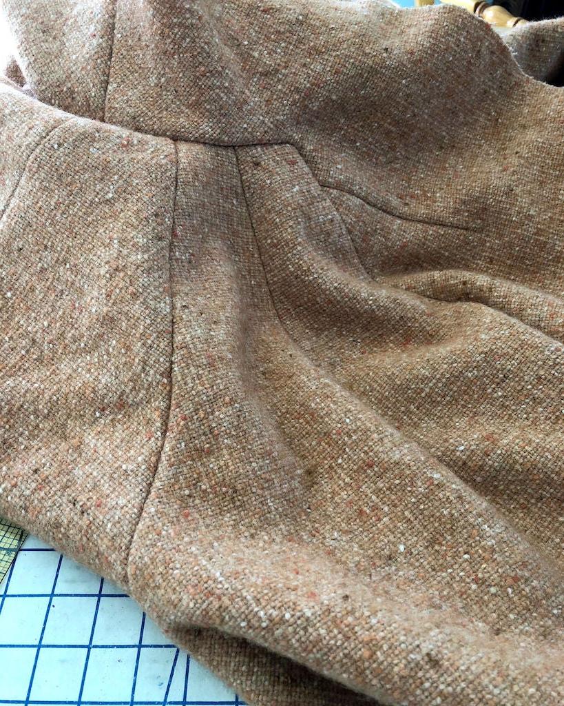Используйте обрезки органзы для обработки всех крайних частей пальто. Шелк добавляет очень небольшую массу, а плотное переплетение действует как барьер между отрезанной и остальной частью ткани. Это похоже на идею остаточного шитья, но гораздо более надежно (особенно для рыхлой плотной ткани).