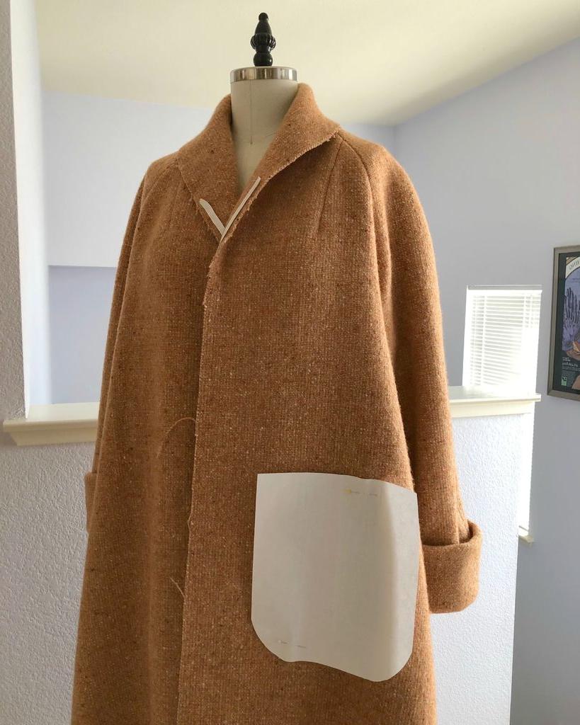 Сделайте выкройку будущих карманов самостоятельно, чтобы поэкспериментировать с подходящим для вас размером, расположением и дизайном. Вы можете просто прикрепить карман из кальки прямо на пальто с помощью булавок, чтобы представить полную картину будущего изделия.