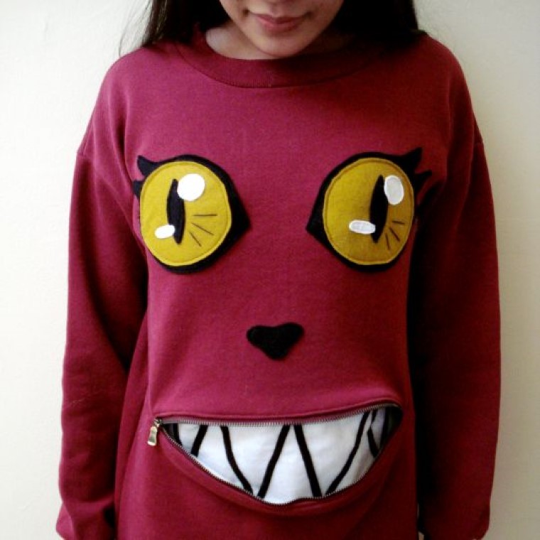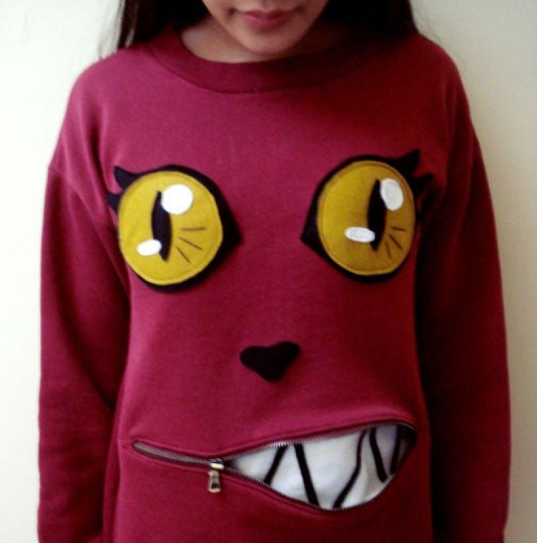 Скучная толстовка превращается в оригинальный свитер с мордочкой кошки благодаря застежке-молнии, с помощью которой открывается ужасно симпатичный зубастый рот.