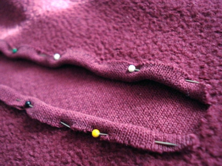 После горизонтального надреза необходимо сделать два вертикальных. Это требуется для того, чтобы в будущем рот свободно мог "открываться". Затем толстовку следует вывернуть наизнанку и закрепить иголками вдоль горизонтального разреза. Разрез теперь подшивается в тех местах, которые подколоты.