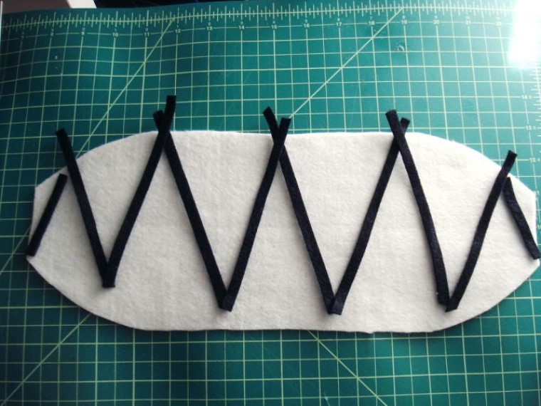 Из черного фетра вырезаются тонкие полоски ткани и выкладывается рисунок, имитирующий зубастый рот. Ткань лучше всего закрепить с помощью клеевого пистолета.