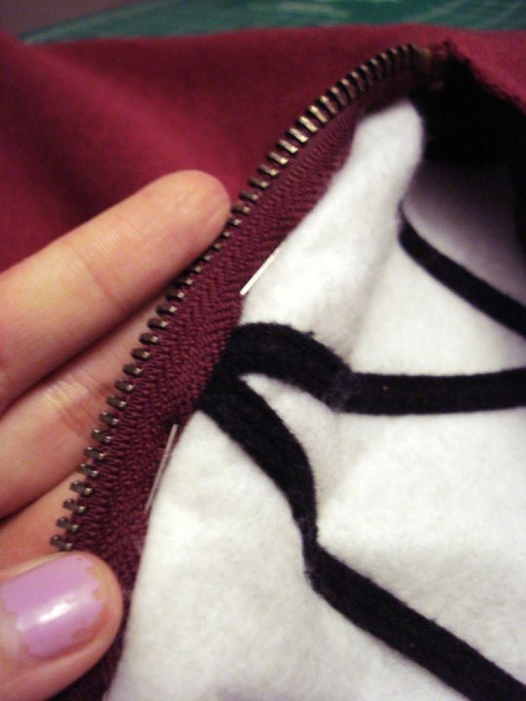 Этот этап - самый сложный, требующий сноровки и навыков шитья. На толстовке, в месте, где будет располагаться зубастый рот, необходимо отметить размер. Его длина равна длине молнии.