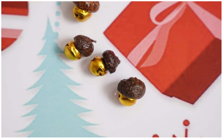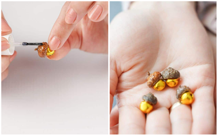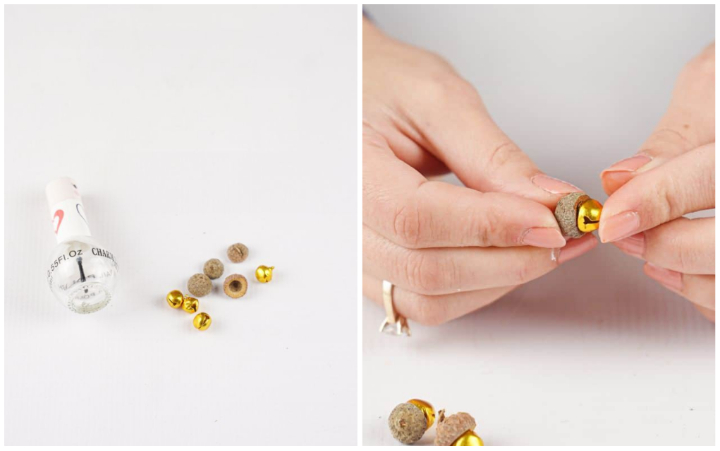 Оторвите шляпку от желудя и с помощью клеевого пистолета прикрепите ее к миниатюрному колокольчику. Далее нанесите прозрачный лак для ногтей на шляпку от желудя. Тогда на поверхности появится красивый блеск. Кроме того, с помощью такого покрытия можно продлить срок эксплуатации изделия.